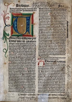 Illumination comprises a large initial 'N' on first leaf of text (a2), enclosing a gouache of an Aristotelian scribe in a red toga at a wooden desk, and with floral border extensions of acanthus leaves, tulips and daisies in red, blue, green and white; central floral border to the double column text throughout; and a 6-line initial 'Q' on a gold background on q1 at the start of the second part.