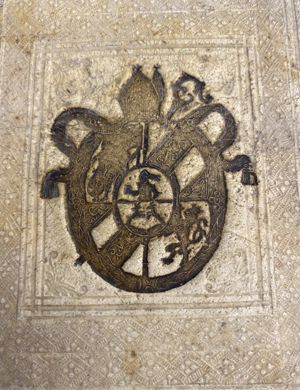 Transcription: azure on a pale, three towers, between four lions' paws affronté issuant from the flanks of the shield; surmounted by a coronet; in the corners the initials 'B.C.D.L.'