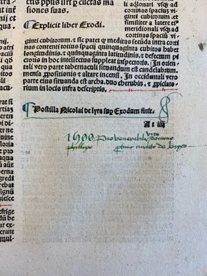 Biblia latina (cum postillis Nicolai de Lyra et expositionibus Guillelmi Britonis in omnes prologos S. Hieronymi et additionibus Pauli Burgensis replicisque Matthiae Doering). Add: Nicolaus de Lyra: Contra perfidiam Judaeorum