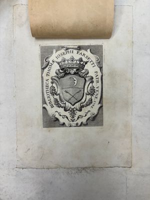 Ex-Libris with Maria in heaven, surrounded by putti. Below a heart on a stick pierced with arrows. On the left a lamb bearing a banner. On the left an right side two figures. The left person with a chalice with snake, the right with a cup. Detail of page.