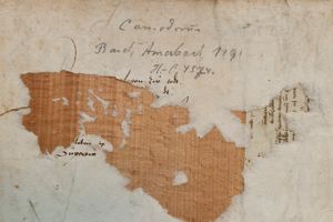 Inscription on front pastedown in black ink, most of this has been torn away.