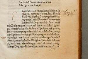 Vera historia [Latin]. Tr: Lilius (Tifernas) Castellanus. Add: De asino aureo; Philosophorum vitae; Scipio; Tyrannus; Scaphidium (Dialogus de funerali pompa); Palinurus; Charon; Diogenes; Terpsion; Hercules; Virtus dea; In amorem; Timon; Sermo de calumnia; Laus muscae. Ed: Benedictus Bordonus; Maephus Vegius: De Felicitate et miseria