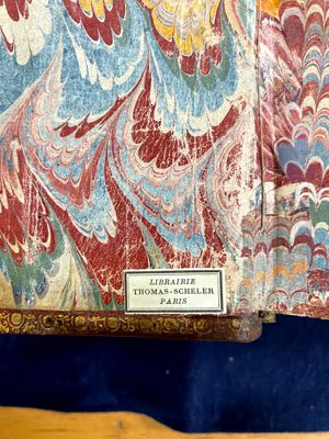 Ex libris della Biblioteca Parmense raffigurante l'Apollo Palatino, utilizzato al tempo del primo bibliotecario della Palatina, Paolo Maria Paciaudi (1761- 1785, date indicative perché per un periodo Paciaudi fu esonerato dall'incarico per motivi politici) sul contropiatto anteriore.